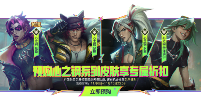 预购心之钢皮肤享独家限时折扣,参与组团领取限定队旗,抽取免单福利!