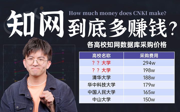 【毕导】我扒了全国50所高校的知网采购费,被坑得最惨的学校竟然是它……最近中科院因为知网订购费用太贵而停用了知网。我当场查了查全国各大高校订阅知网的费用,才发现看知网的文献原来这么贵!你们学校为知网花了多少钱呢?以及另一个问题是,贵还不得不买的话,又应该怎么办?