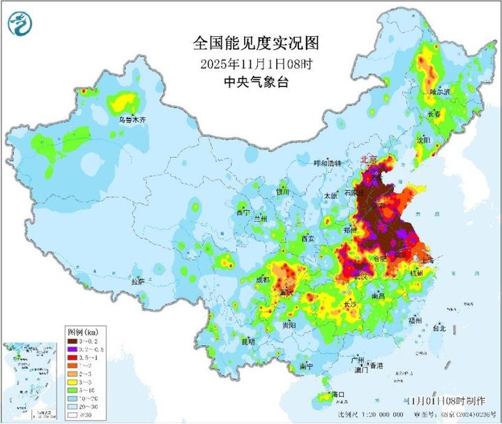 今晨,大雾橙色预警高挂,监测显示,北京东南部、天津南部、河北中南部、河南中东部、山东西部、湖北北部、苏皖中北部部分地区出现能见度不足200米的强浓雾。预计今天上午,这一带地区大雾将逐渐消散。11月2日至3日,随着冷空气南下,全国大部大气扩散条件较好,无大范围大雾天气。