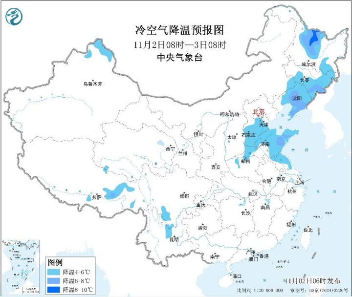 冷空气继续影响北方。受冷空气影响,昨日,内蒙古中东部、黑龙江西部、吉林中西部、辽宁、北京、河北北部等地出现6~8级阵风,局地9~10级;今晨,内蒙古中东部等地出现8~12℃降温, 局地降幅达14~19℃。