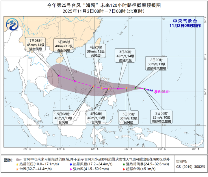 今年第25号台风生成。今年第25号台风“海鸥”已于11月1日晚上生成,今晨8点位于菲律宾马尼拉东偏南方向约1550公里的洋面上;预计“海鸥”将以每小时20公里左右的速度向西偏北方向移动,4日穿过菲律宾中部,5日移入南海东部海面上,未来逐渐趋向越南中南部沿海,强度逐渐加强,最强可达台风级或强台风级(40~48米/秒,13~15级)。