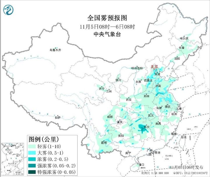 中央气象台今晨还发布了大雾黄色预警。预计,11月5日早晨至上午,北京东南部、天津中西部、河北中南部、山东西部和南部、江苏中北部、安徽北部、湖南中北部等地的部分地区有大雾,局地有能见度不足200米的强浓雾。