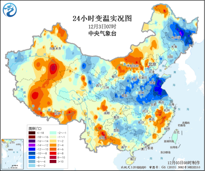 随着寒潮主体进一步东移南下,过去一天我国中东部地区气温持续下跌。最新气象监测显示,3日早晨,山东、河南、江苏、安徽一带气温下降幅度达到4~8℃,局地降幅超过10℃,最低气温0℃线位于苏皖北部、河南南部至陕西南部等地。