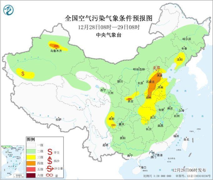 今天早晨,四川盆地受大雾天气影响,局地能见度较低;华北南部、江汉等地大气扩散条件较昨日有所下降。预计28日白天,华北中南部、黄淮中西部、江汉等地部分地区有轻至中度霾,局地重度霾。28日夜间起,冷空气活动频繁,上述地区大气扩散条件转好。