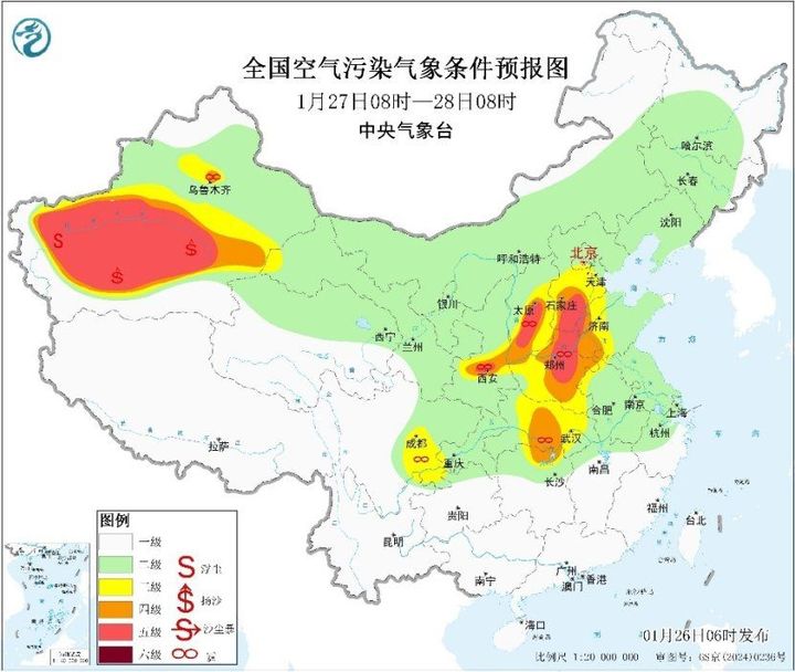 华北黄淮等地仍有霾天气。26日至28日,华北中南部、黄淮中西部、汾渭平原等地大气扩散条件转差,有轻至中度霾,部分地区重度霾。29日起,受冷空气和降水共同影响,霾天气逐渐减弱消散。