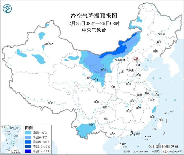 另外,25-26日,受冷空气影响,内蒙古中东部、华北、黄淮、东北地区等地气温将下降4~8℃,其中内蒙古东部、黑龙江、吉林西部等地降温可达10℃以上;上述地区并伴有4~6级偏北风,阵风7~8级,新疆山口地区风力可达10~11级。