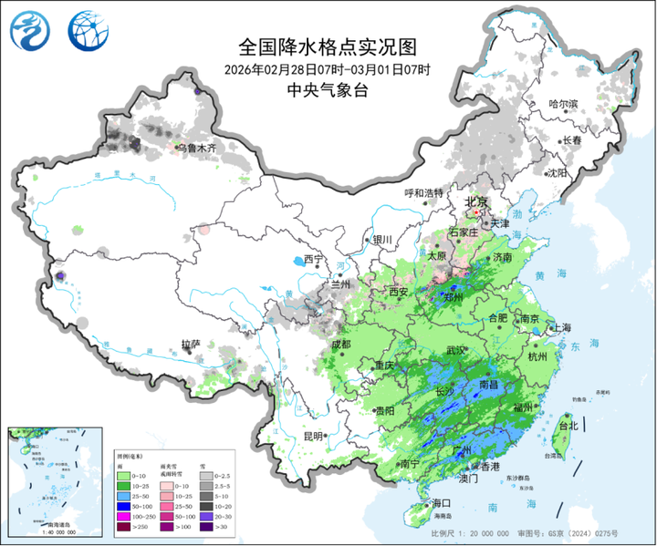 昨日,四川盆地西部及江南中西部、华南中东部等地出现中到大雨,湖南中部、江西中部、广西东部、广东中东部、福建南部等局地暴雨(50~98毫米);新疆伊犁河谷和沿天山一带、青海东部、甘肃东部、内蒙古东部、山西东部、河北南部、河南北部等地部分地区出现小到中雪或雨夹雪。