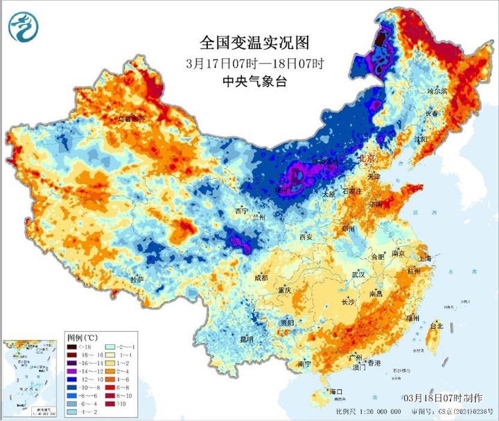 今晨,受冷空气活动影响,内蒙古、宁夏北部等地出现6~10℃降温,局地降温幅度超14℃。