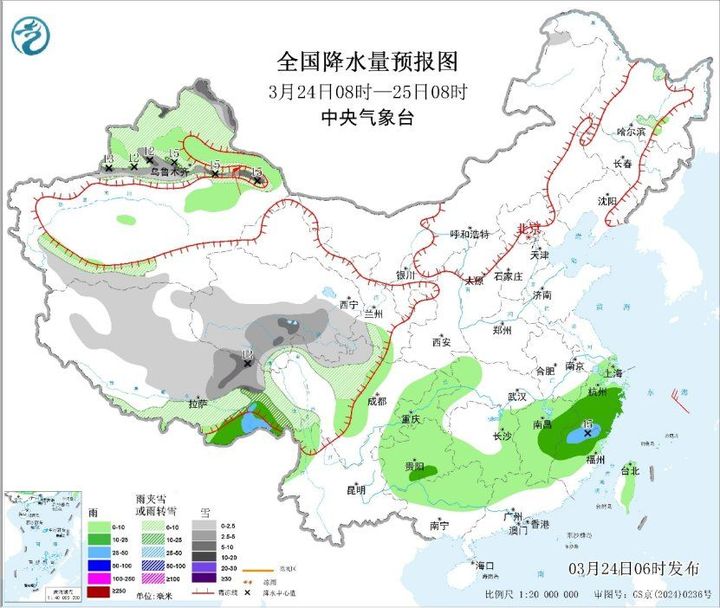 其中今天,新疆北疆阿勒泰山区和沿天山地区、西藏东北部、青海东南部等地部分地区有大到暴雪(10~15毫米);江西中部、浙江中南部、福建北部等地有中到大雨。