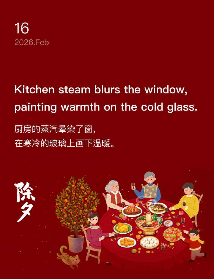 厨房的蒸汽晕染了窗,在寒冷的玻璃上画下温暖。
